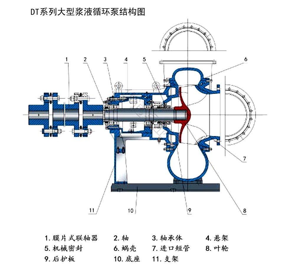 大型臥式脫硫循環(huán)泵的泵頭為單層殼體結(jié)構(gòu)。葉輪與軸采用螺紋連結(jié),軸封采用機(jī)械密封。懸架部分采用稀油潤(rùn)滑型式。脫硫泵廣泛用于火電廠、煉鋁廠和煉油廠等行業(yè)的脫硫系統(tǒng)。漿液中允許氯離子含量達(dá)60000ppm,漿液的PH值允許在2.5~13之間,