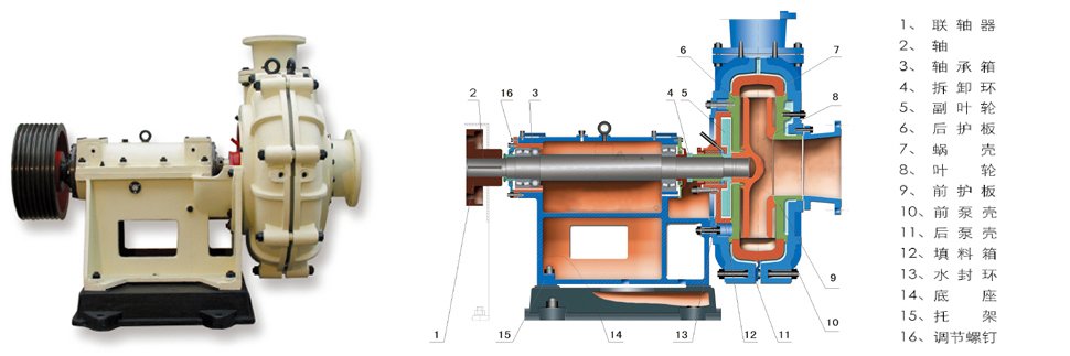 該系列泵為單級單吸離心式渣漿泵,泵體采用內(nèi)外雙金屬結構,泵殼為垂直中開式出水口可按45°間隔旋轉(zhuǎn)八個不同的位置。適用于電力、冶金、煤炭、建材等行業(yè),處理介質(zhì)為含有固體顆粒的磨蝕性或腐蝕性漿體,固液混合濃度灰漿為45%,礦漿為60%,介質(zhì)溫度≤60°C,該型泵可以多級串級使用。過流部件采用了自行研制的抗磨蝕的高鉻耐磨合金鑄鐵制造,泵體采用雙泵殼結構,方便更換過流部件;根據(jù)壓力需要外泵殼采用球墨鑄鐵或灰鑄鐵,內(nèi)泵殼采用高鉻抗磨白口鑄鐵或鑄鋼.